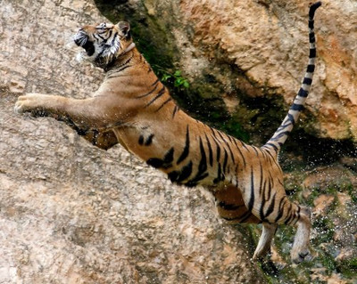 Излюбленный способ атаки – сбоку или сзади; с расстояния 20-30 м тигр делает четыре-пять стремительных прыжков. Он прочно охватывает шею животного передними лапами и вонзает в него огромные зубы (длиной 5-7 см), одновременно раздирая голову и плечи острыми когтями. Благодаря мягким подушечкам на лапах хищник подкрадывается настолько тихо, что жертва порой не успевает даже предпринять попытки к бегству. Однако если кабан или олень вовремя среагируют на появление хищника, у них есть шанс остаться в живых. За кабаном тигр может пробежать примерно 300 м, а вот преодолевать такое расстояние, чтобы поймать косулю, не станет. Зверь прекрасно понимает: если не удалось взять оленя сразу, то продолжать за ним погоню бесполезно. Длина прыжка, например, у изюбря почти на метр больше, чем у тигра. Подобно льву, тигр не умеет и не любит долго бегать. Другие животные об этом знают, поэтому, пробежав около 300 м, переходят на обычный шаг.